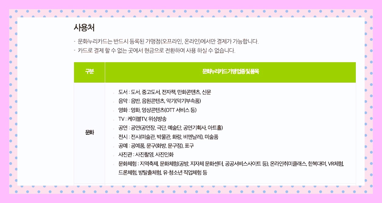 문화누리카드의 사용처는 매우 다양합니다. 관광, 문화, 체육 관련 업종뿐만 아니라, 도서나 음반 등 문화생활과 직접적으로 관련된 상품을 판매하는 가게에서도 사용할 수 있습니다. 온라인 구매 시에도 이 카드를 활용할 수 있어, 접근성이 매우 높습니다. 전시회 관람이나 다양한 문화 체험 활동에도 이용할 수 있어, 개인의 취향과 관심사에 맞는 활동을 선택하여 즐길 수 있는 장점이 있습니다.